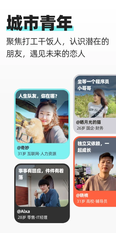 3、平台聚焦城市打工干饭人群体,让志同道合的朋友在快节奏都市中遇见命中注定恋人